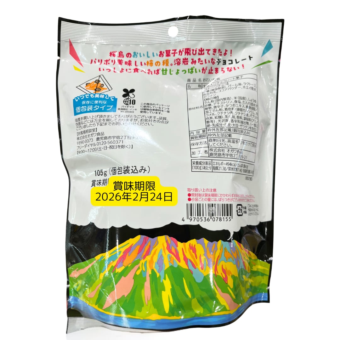 鹿児島発のユニークなお菓子「お石い桜島 ストーンチョコ」105g×3個セット。1個当たり個包装12袋入りで保存や持ち運びに便利。チョコと柿の種の食感と味のバランスが絶妙。