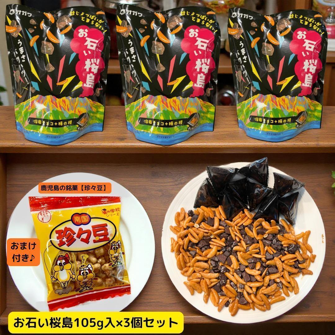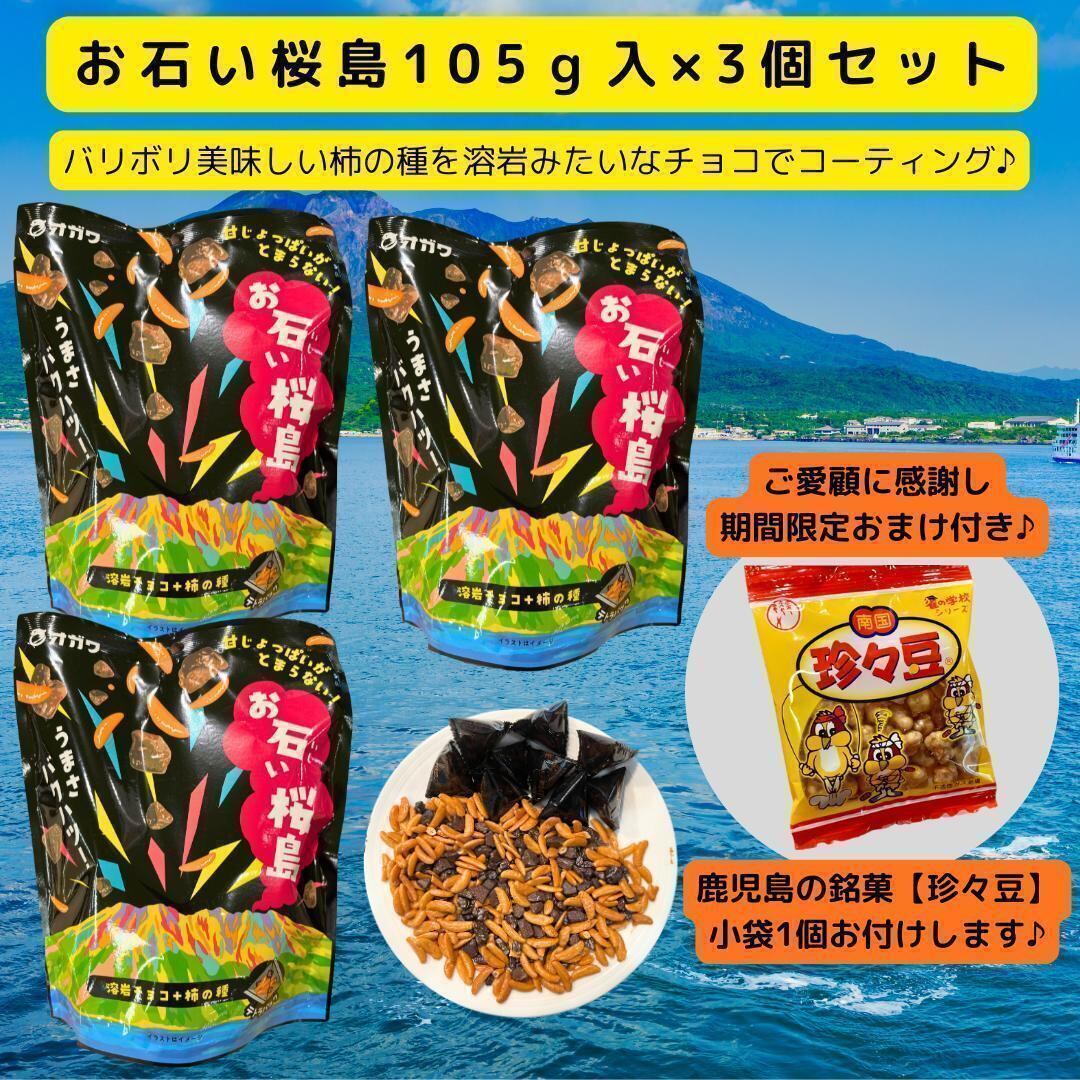 鹿児島発のユニークなお菓子「お石い桜島 ストーンチョコ」105g×3個セット。個包装12袋入りで保存や持ち運びに便利。チョコと柿の種の食感と味のバランスが絶妙。原材料:ココアパウダー、ゼラチン、米、唐辛子、着色料など。アレルゲン:乳成分・大豆・ゼラチン・小麦。