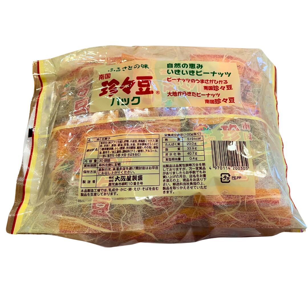「鹿児島の銘菓」として親しまれる豆菓子2種、雀の卵(甘口しょうゆ味)と珍々豆(ピリ辛しょうゆ味)の懐かし駄菓子セット。どちらも香ばしく煎り上げた落花生を使用し、昔ながらの味を再現。個包装で職場やイベントの配布にも最適です。原材料:落花生、小麦粉、砂糖、しょうゆ、でん粉、寒梅粉ミックス、植物油脂、香辛料、食塩、加工でん粉、膨張剤、カラメル色素。常温保存可能でストックにも便利。