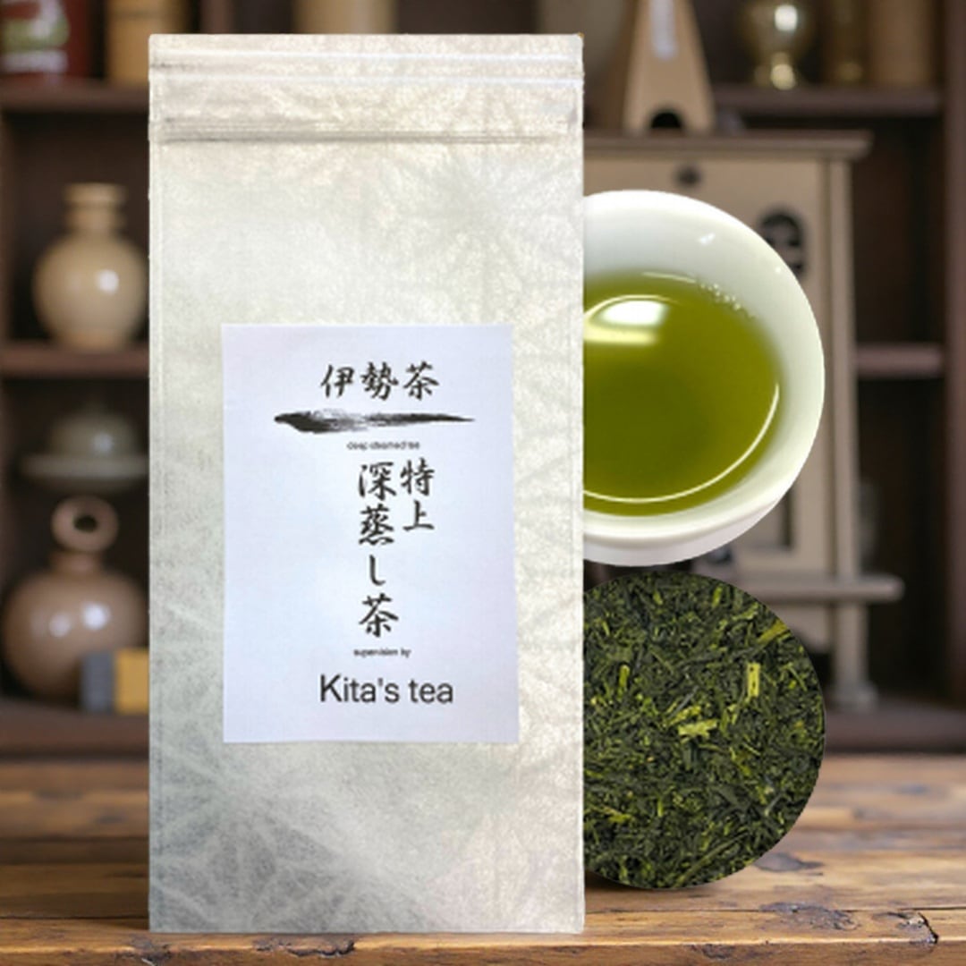 三重県産の伊勢茶を使用した特上深蒸し煎茶です。一番茶のみを使用し、深蒸し製法で渋みを抑えてまろやかな甘みと濃厚な旨味を実現。原材料は国産茶葉100%で、お湯でも水出しでも美味しく楽しめます。
